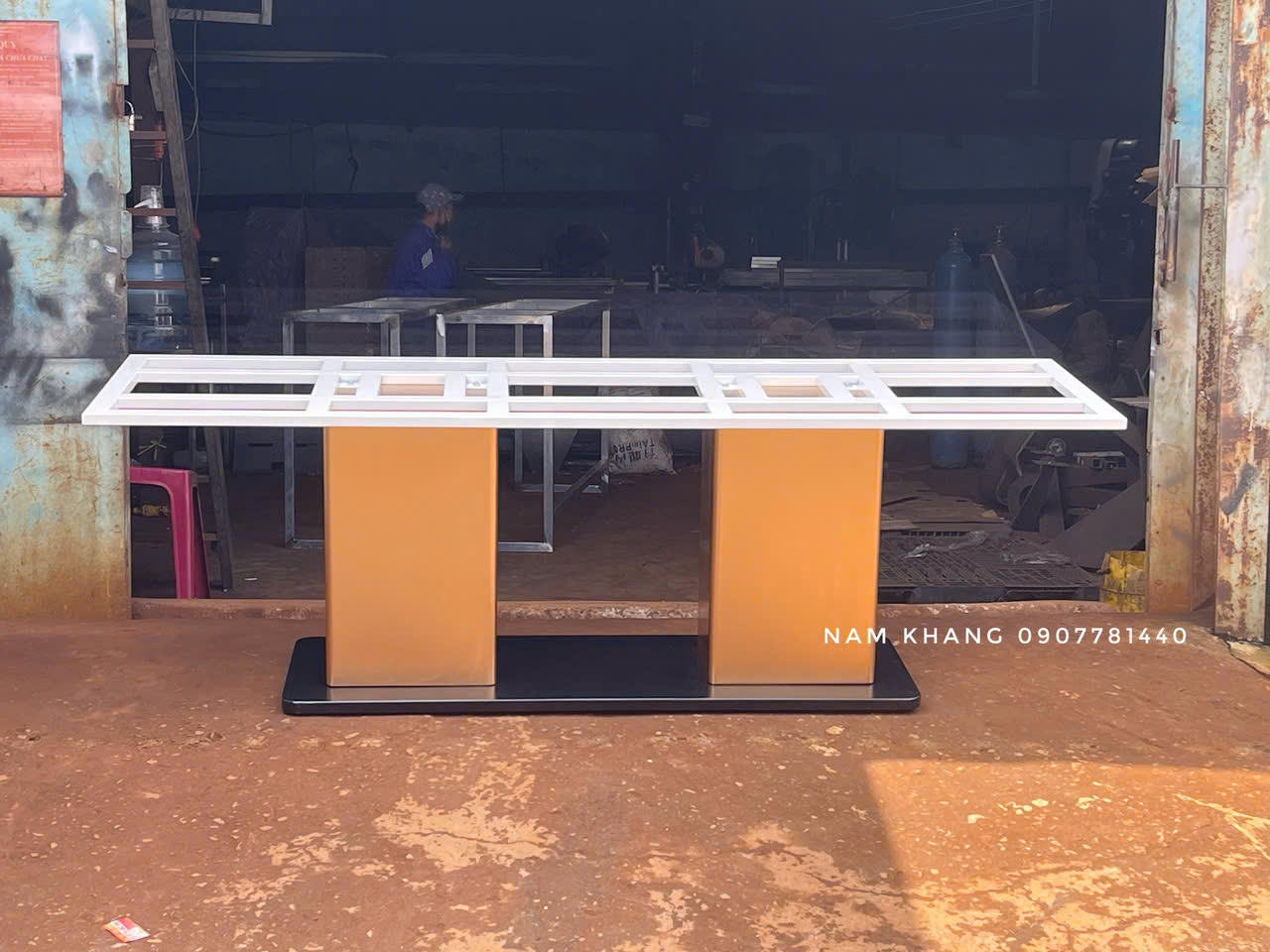 Chất liệu : Chân bàn đế thép tấm dày 2 ly tạo hình, 2 trụ vàng là thép tấm 2 ly tạo hình , bệ đỡ là sắt hộp 25x50